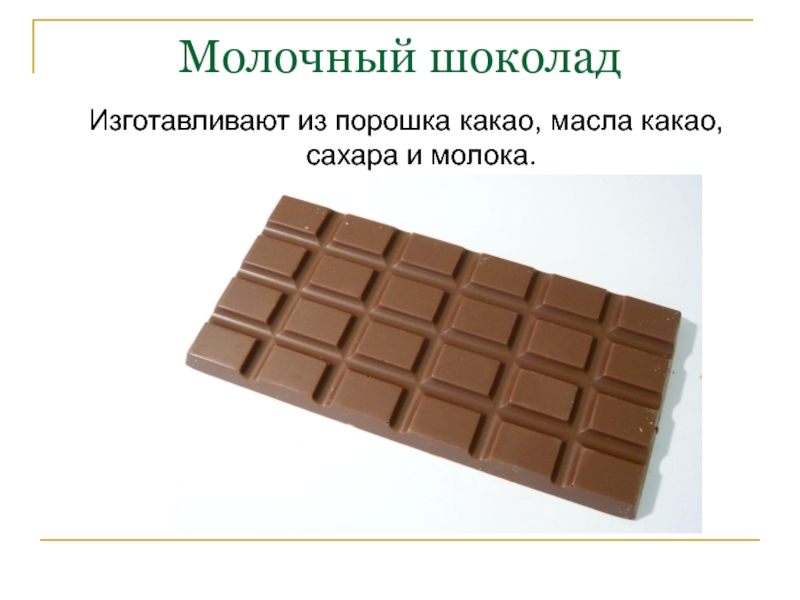 Молочный шоколадИзготавливают из порошка какао, масла какао, сахара и молока.
