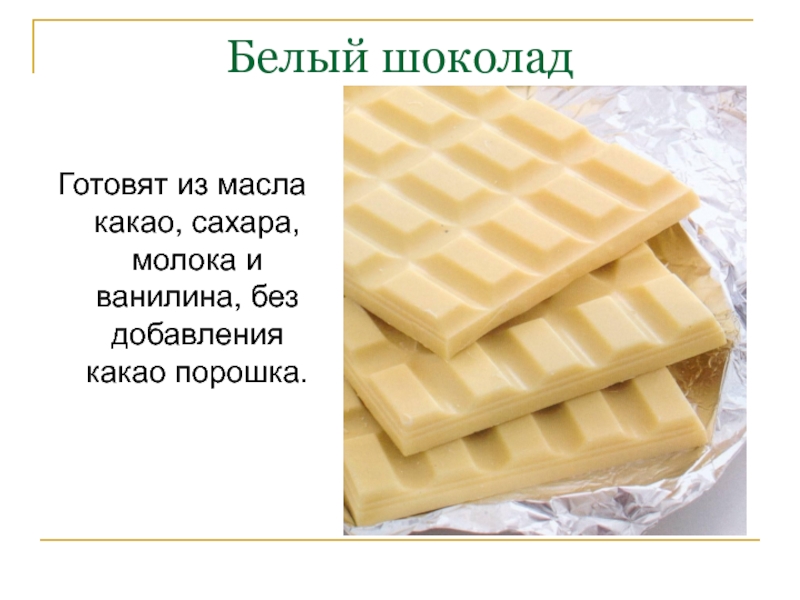 Белый шоколадГотовят из масла какао, сахара, молока и ванилина, без добавления какао порошка.