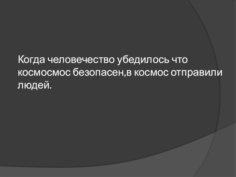 Слайд 19Когда человечество убедилось что космосмос безопасен,в космос отправили людей.