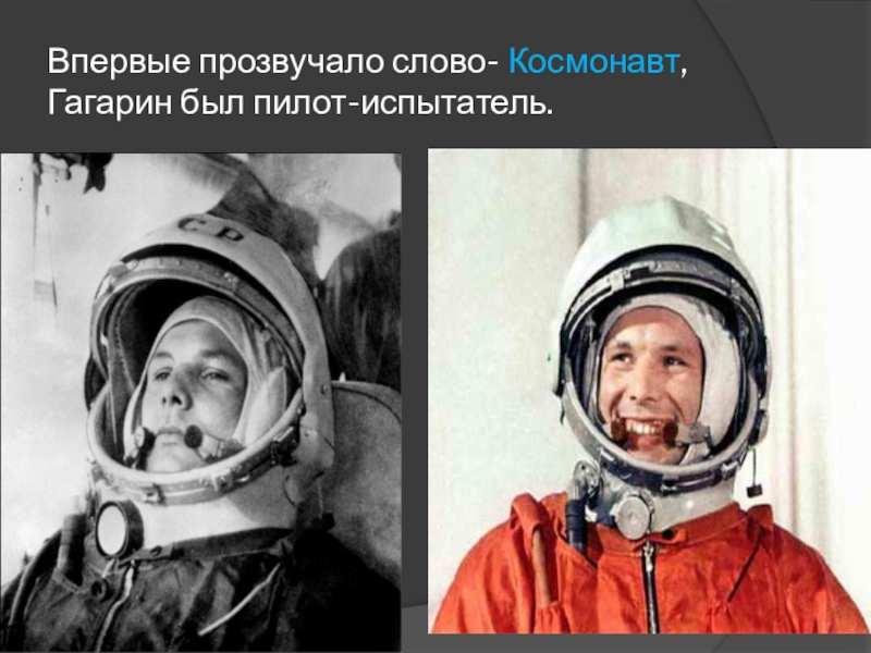 Слайд 21Впервые прозвучало слово- Космонавт, Гагарин был пилот-испытатель.