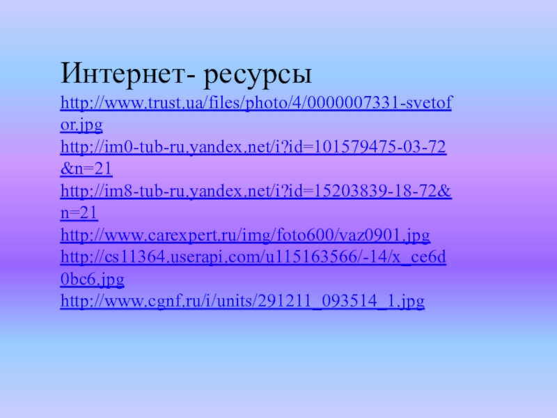 Интернет- ресурсыhttp://www.trust.ua/files/photo/4/0000007331-svetofor.jpghttp://im0-tub-ru.yandex.net/i?id=101579475-03-72&n=21http://im8-tub-ru.yandex.net/i?id=15203839-18-72&n=21http://www.carexpert.ru/img/foto600/vaz0901.jpghttp://cs11364.userapi.com/u115163566/-14/x_ce6d0bc6.jpghttp://www.cgnf.ru/i/units/291211_093514_1.jpg