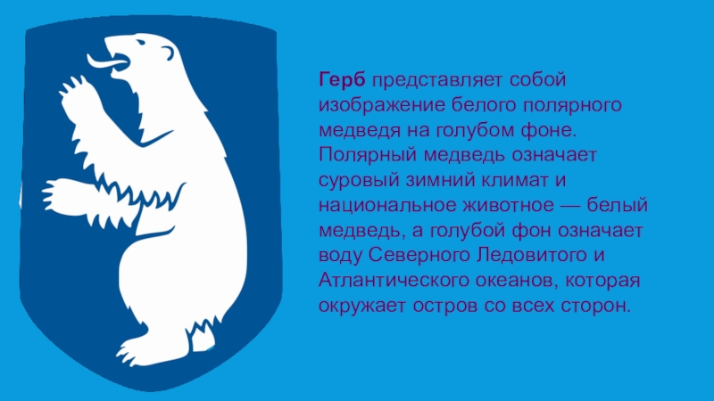 Слайд 6Герб представляет собой изображение белого полярного медведя на голубом фоне. Полярный медведь