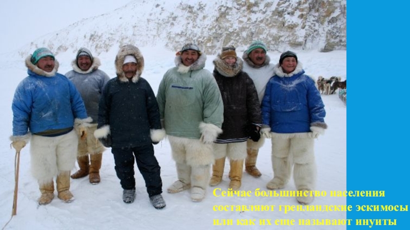 Слайд 15Сейчас большинство населения составляют гренландские эскимосы или как их еще называют