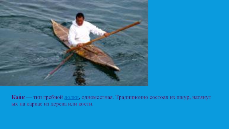 Слайд 18Кая́к — тип гребной лодки, одноместная. Традиционно состоял из шкур, натянутых на каркас из дерева или кости.