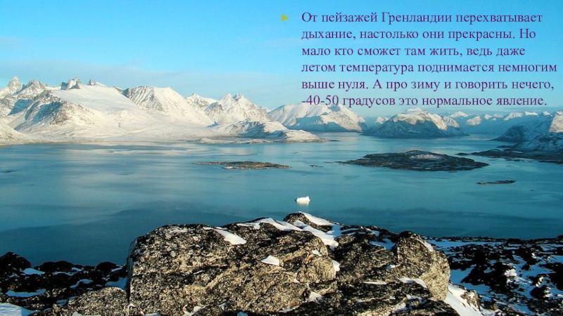Слайд 7От пейзажей Гренландии перехватывает дыхание, настолько они прекрасны. Но мало кто