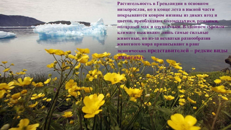 Слайд 9Растительность в Гренландии в основном низкорослая, но в конце лета в