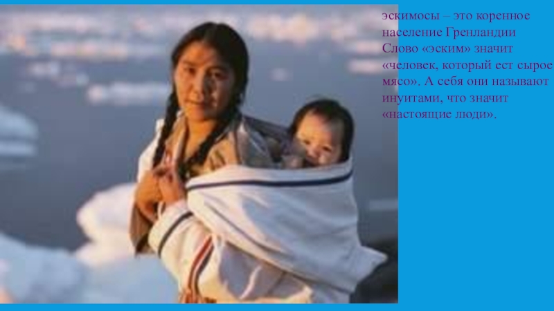 эскимосы – это коренное население ГренландииCлово «эским» значит «человек, который ест сырое мясо». А себя они называют