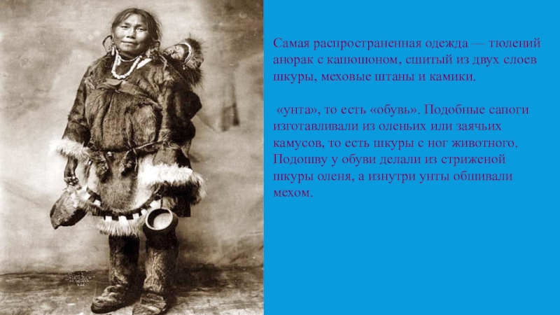 Самая распространенная одежда — тюлений анорак с капюшоном, сшитый из двух слоев шкуры, меховые штаны и камики. «унта», то