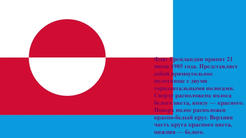 Слайд 5Флаг Гренландии принят 21 июня 1985 года. Представляет собой прямоугольное полотнище