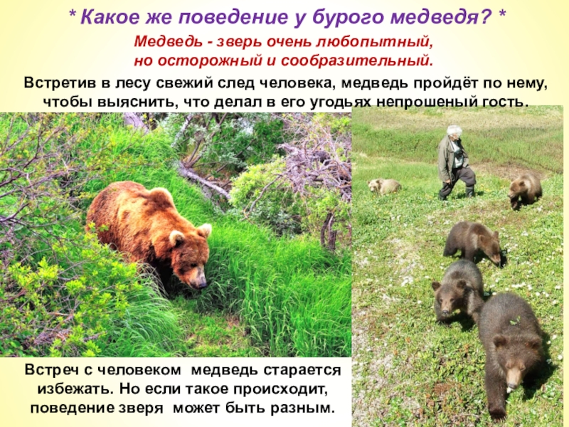 Встреч с человеком медведь старается избежать. Но если такое происходит, поведение зверя может быть разным.