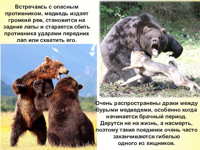 Очень распространены драки между бурыми медведями, особенно когда начинается брачный период. Дерутся не на жизнь, а насмерть, поэтому такие поединки очень часто заканчиваются гибелью