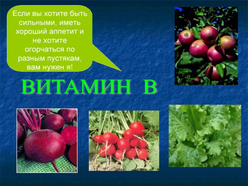 Овощей и фруктовнужно есть как можнобольше, потому что в них много витаминови других полезныхвеществ. Без витаминовчеловек болеет!