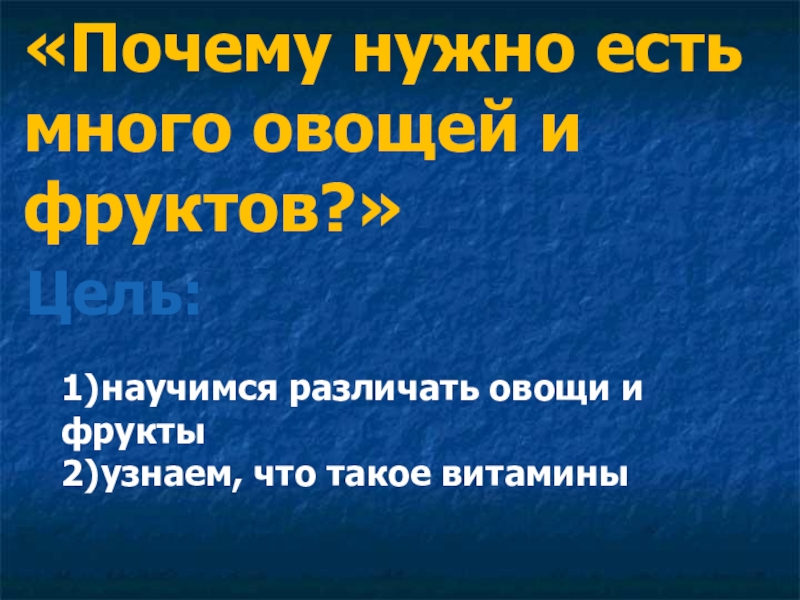 «Почему нужно есть много овощей и фруктов?»Цель:1)	научимся различать овощи и фрукты2)	узнаем, что такое витамины
