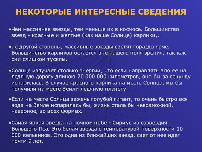 Самая яркая звезда на ночном небе - Сириус из созвездия Большого Пса. Это белая звезда с температурой поверхности 10 000 кельвинов. Это одна из ближайших звезд, свет от нее идет почти 9 лет.
