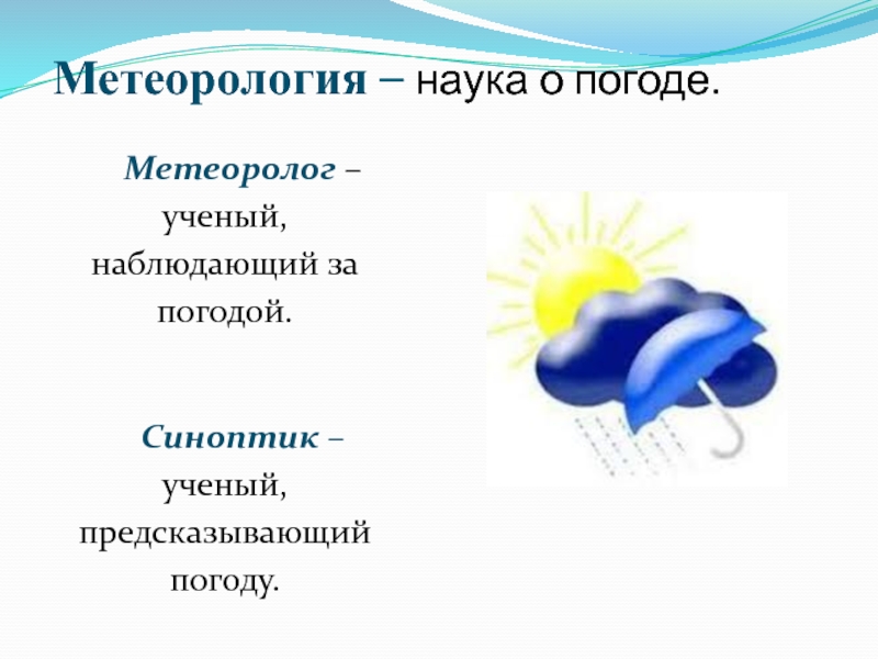 Метеорология – наука о погоде.Метеоролог – ученый, наблюдающий за погодой.Синоптик – ученый, предсказывающий погоду.