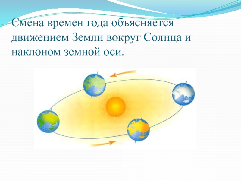Слайд 4Смена времен года объясняется движением Земли вокруг Солнца и наклоном земной