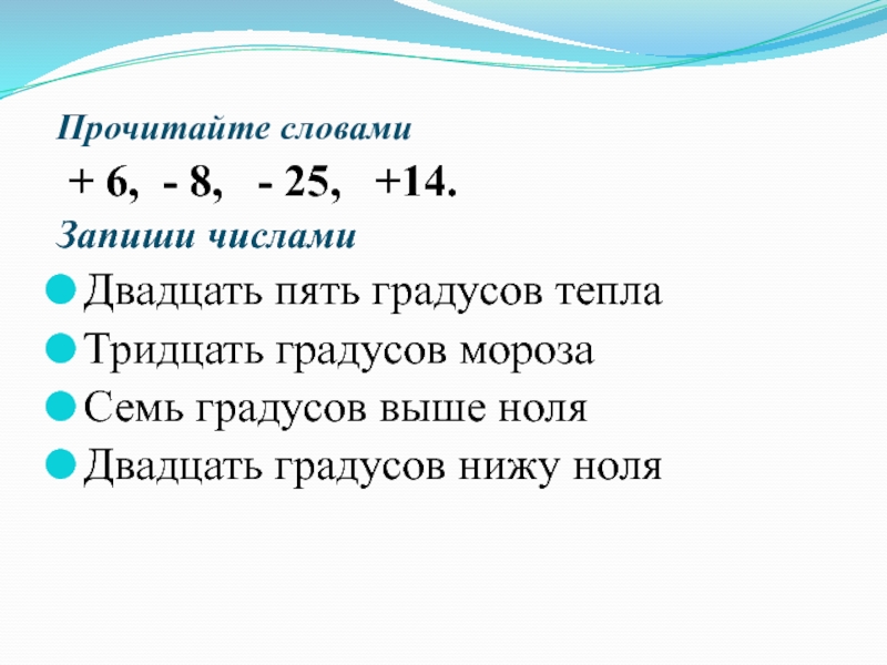 Прочитайте словами + 6, - 8,  - 25,  +14.Запиши числамиДвадцать пять градусов теплаТридцать градусов морозаСемь