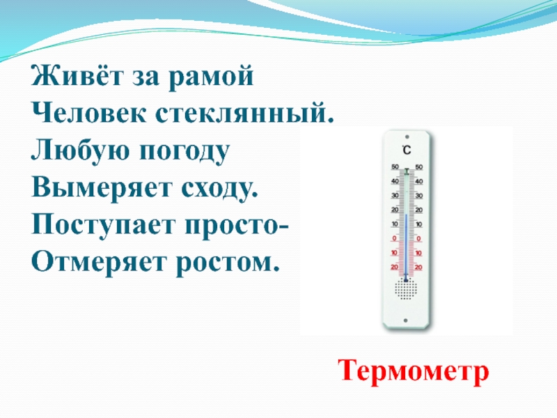 Слайд 7Живёт за рамой Человек стеклянный. Любую погоду Вымеряет сходу. Поступает просто- Отмеряет ростом.