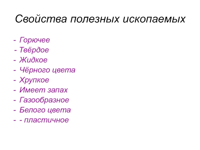 Свойства полезных ископаемыхГорючее            - ТвёрдоеЖидкоеЧёрного цветаХрупкоеИмеет