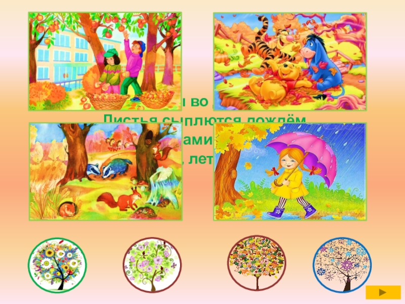 Утром мы во двор идём - Листья сыплются дождём, Под ногами шелестят И летят, летят, летят..