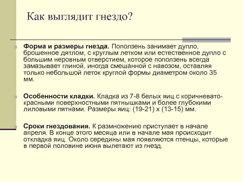 Форма и размеры гнезда. Поползень занимает дупло, брошенное дятлом,