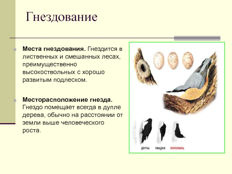 ГнездованиеМеста гнездования. Гнездится в лиственных и смешанных лесах, преимущественно высокоствольных с хорошо развитым подлеском. Месторасположение гнезда. Гнездо