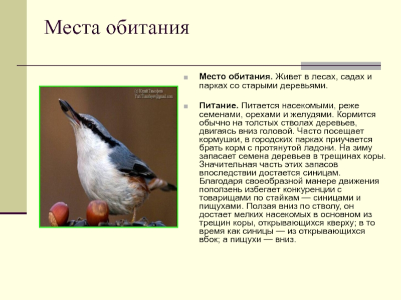 Места обитанияМесто обитания. Живет в лесах, садах и парках со старыми деревьями.Питание. Питается насекомыми, реже семенами, орехами