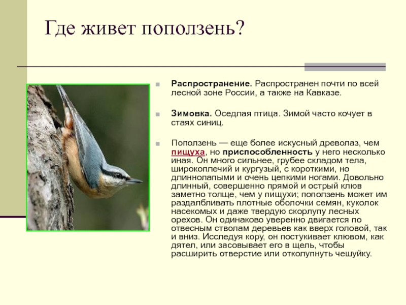 Где живет поползень?Распространение. Распространен почти по всей лесной зоне России, а также на Кавказе. Зимовка. Оседлая птица.