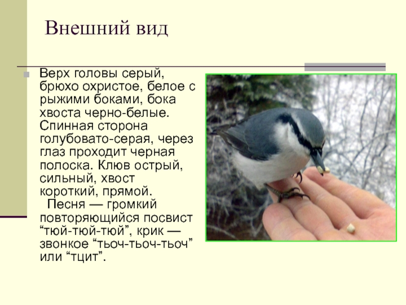 Внешний вид Верх головы серый, брюхо охристое, белое с рыжими боками, бока хвоста черно-белые. Спинная сторона голубовато-серая, через глаз проходит черная полоска. Клюв острый, сильный, хвост короткий, прямой.   Песня — громкий повторяющийся посвист “тюй-тюй-тюй”,