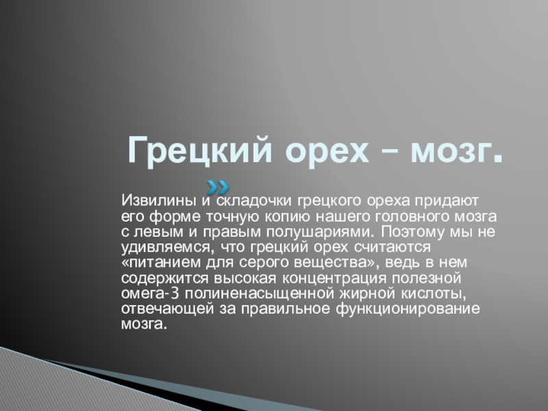 точную копию нашего головного мозга с левым и правым полушариями. Поэтому мы не удивляемся, что грецкий орех считаются «питанием для серого вещества», ведь в нем содержится высокая концентрация полезной омега-3 полиненасыщенной жирной кислоты, отвечающей за правильное функционирование мозга.