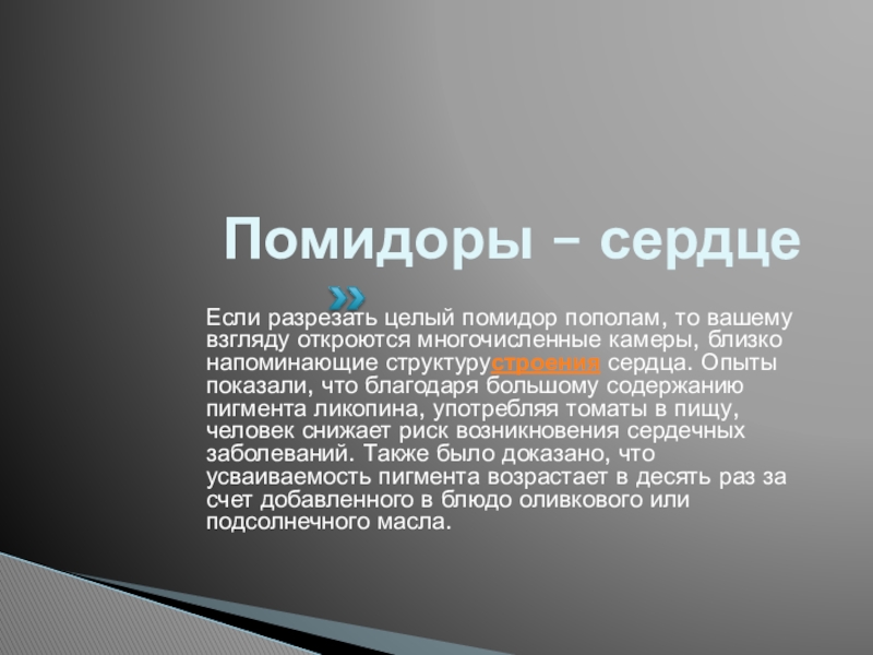 многочисленные камеры, близко напоминающие структурустроения сердца. Опыты показали, что благодаря большому содержанию пигмента ликопина, употребляя томаты в пищу, человек снижает риск возникновения сердечных заболеваний. Также было доказано, что усваиваемость пигмента возрастает в десять раз за счет добавленного в блюдо оливкового или подсолнечного масла.
