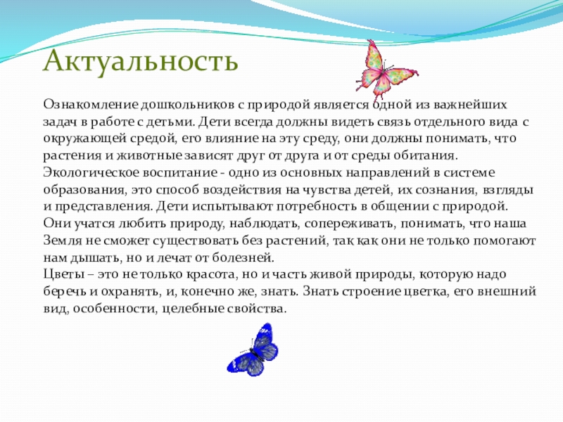 Экологическое воспитание - одно из основных направлений в системе образования, это способ воздействия на чувства детей, их сознания, взгляды и представления. Дети испытывают потребность в общении с природой. Они учатся любить природу, наблюдать, сопереживать, понимать, что наша Земля не сможет существовать без растений, так как они не только помогают нам дышать, но и лечат от болезней.
