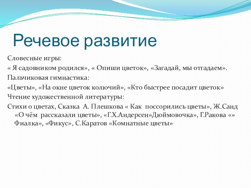 Стихи о цветах, Сказка А. Плешкова « Как поссорились цветы», Ж.Санд «О чём рассказали цветы», «Г.Х.Андерсен»Дюймовочка», Г.Ракова «»Фиалка», «Фикус», С.Каратов «Комнатные цветы»