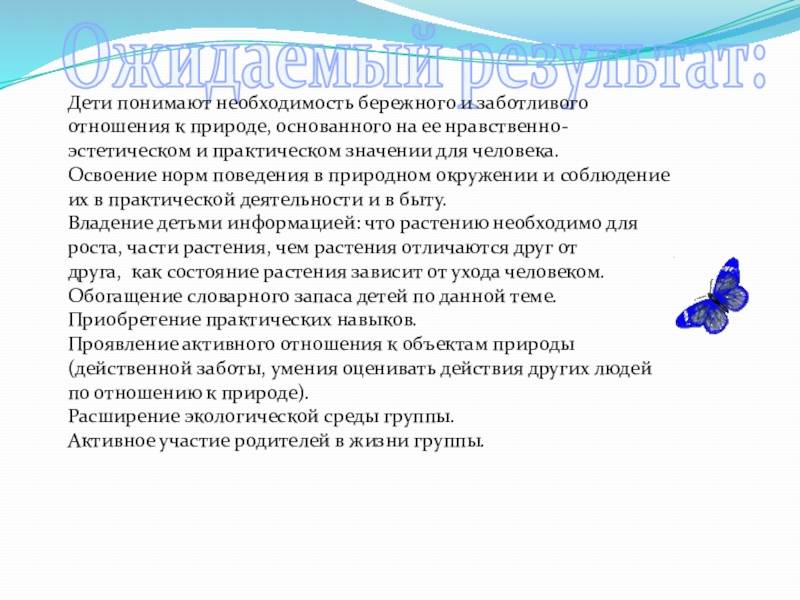 Проявление активного отношения к объектам природы (действенной заботы, умения оценивать действия других людей по отношению к природе).