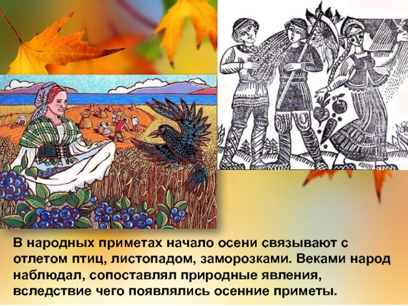 Слайд 3В народных приметах начало осени связывают с отлетом птиц, листопадом, заморозками.