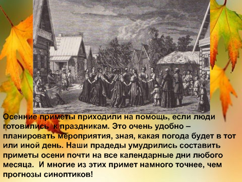 праздникам. Это очень удобно – планировать мероприятия, зная, какая погода будет в тот или иной день. Наши прадеды умудрились составить приметы осени почти на все календарные дни любого месяца. И многие из этих примет намного точнее, чем прогнозы синоптиков!