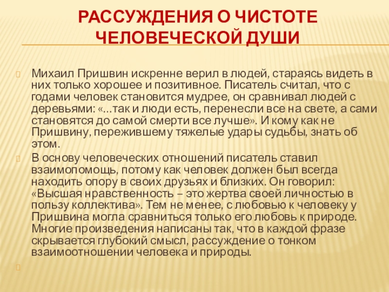 видеть в них только хорошее и позитивное. Писатель считал, что с годами человек становится мудрее, он сравнивал людей с деревьями: «…так и люди есть, перенесли все на свете, а сами становятся до самой смерти все лучше». И кому как не Пришвину, пережившему тяжелые удары судьбы, знать об этом.