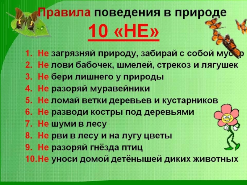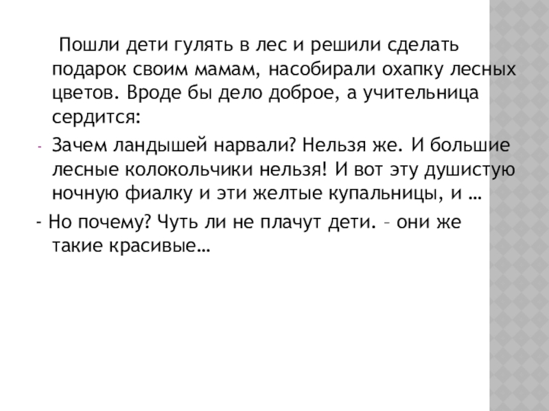 Пошли дети гулять в лес и решили сделать подарок своим мамам, насобирали охапку лесных цветов. Вроде бы дело доброе, а учительница сердится:Зачем ландышей нарвали? Нельзя же. И большие лесные колокольчики нельзя! И вот эту