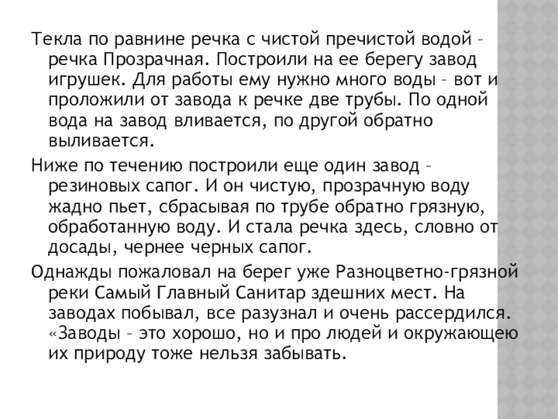 Текла по равнине речка с чистой пречистой водой – речка Прозрачная. Построили на ее берегу завод игрушек.