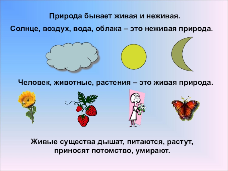 Живые существа дышат, питаются, растут, приносят потомство, умирают.