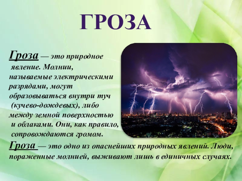 Гроза — это одно из опаснейших природных явлений. Люди, пораженные молнией, выживают лишь в единичных случаях.