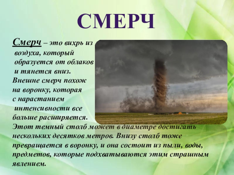 Этот темный столб может в диаметре достигать нескольких десятков метров. Внизу столб тоже превращается в воронку, и она состоит из пыли, воды, предметов, которые подхватываются этим страшным явлением.