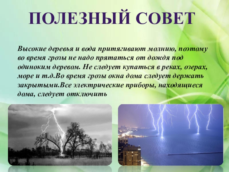 не надо прятаться от дождя под одиноким деревом. Не следует купаться в реках, озерах, море и т.д.Во время грозы окна дома следует держать закрытыми.Все электрические приборы, находящиеся дома, следует отключить