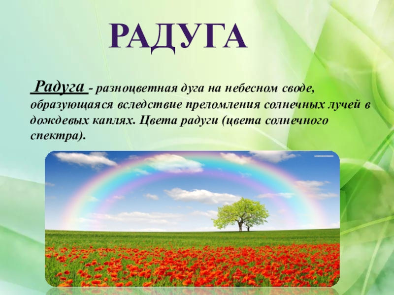 Радуга - разноцветная дуга на небесном своде, образующаяся вследствие преломления солнечных