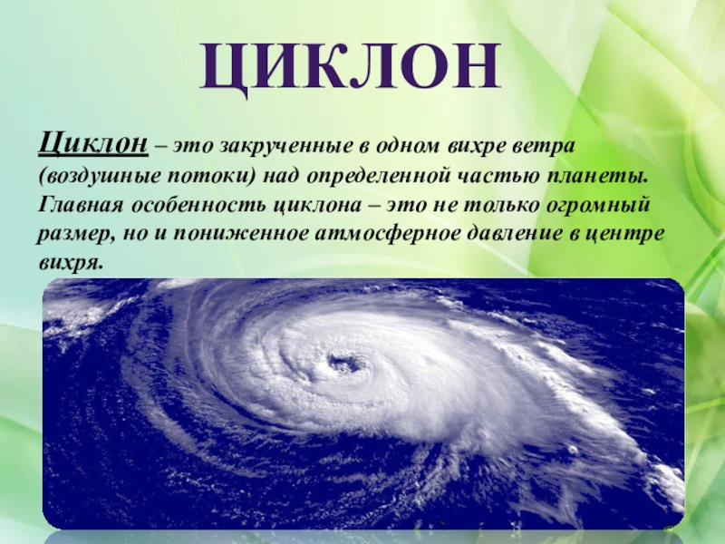 Циклон – это закрученные в одном вихре ветра (воздушные потоки) над