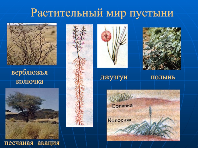 полынь  джузгунпесчаная акацияверблюжья колючкаРастительный мир пустыни