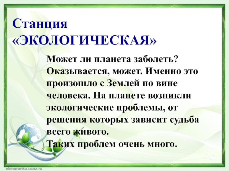 Может ли планета заболеть? Оказывается, может. Именно это произошло с Землей по вине человека. На планете возникли экологические проблемы, от решения которых зависит судьба всего живого.
