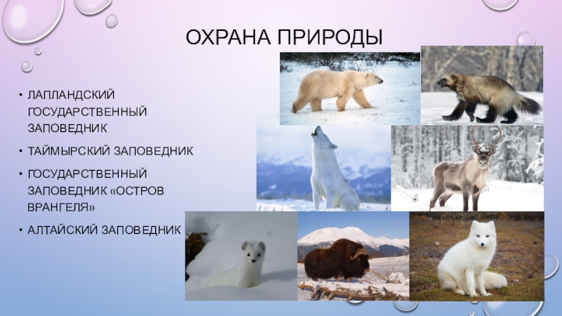 Охрана ПриродыЛапландский государственный заповедникТаймырский заповедникГосударственный заповедник «Остров Врангеля»Алтайский заповедник