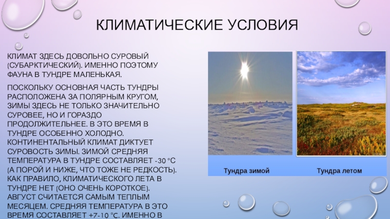 Климатические УсловияКлимат здесь довольно суровый (субарктический). Именно поэтому фауна в тундре маленькая.Поскольку основная часть тундры расположена за
