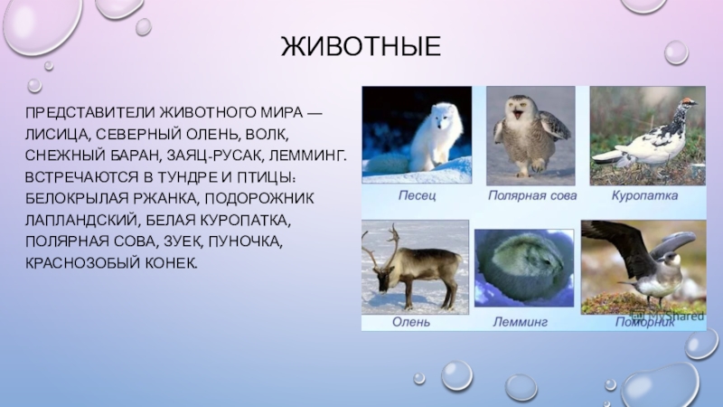 Животныепредставители животного мира — лисица, северный олень, волк, снежный баран, заяц-русак, лемминг. Встречаются в тундре и птицы: